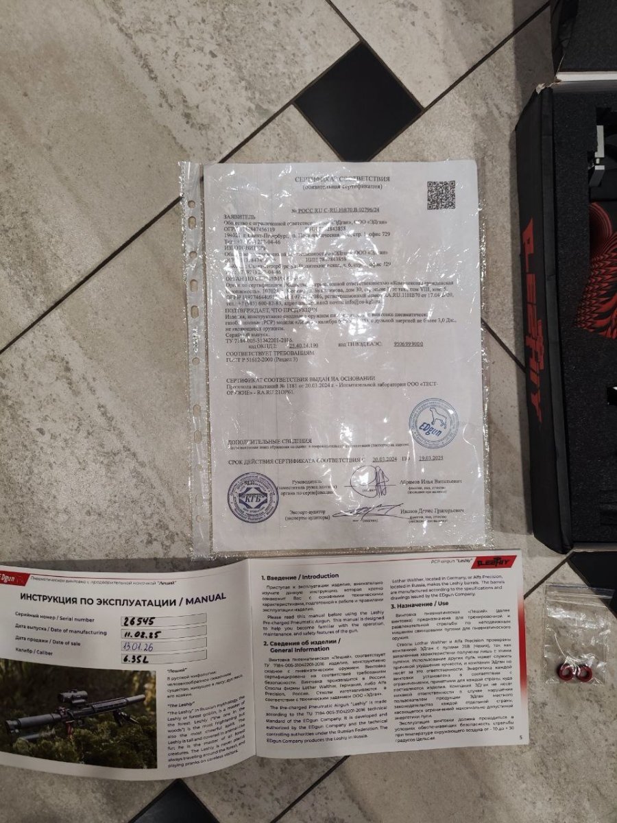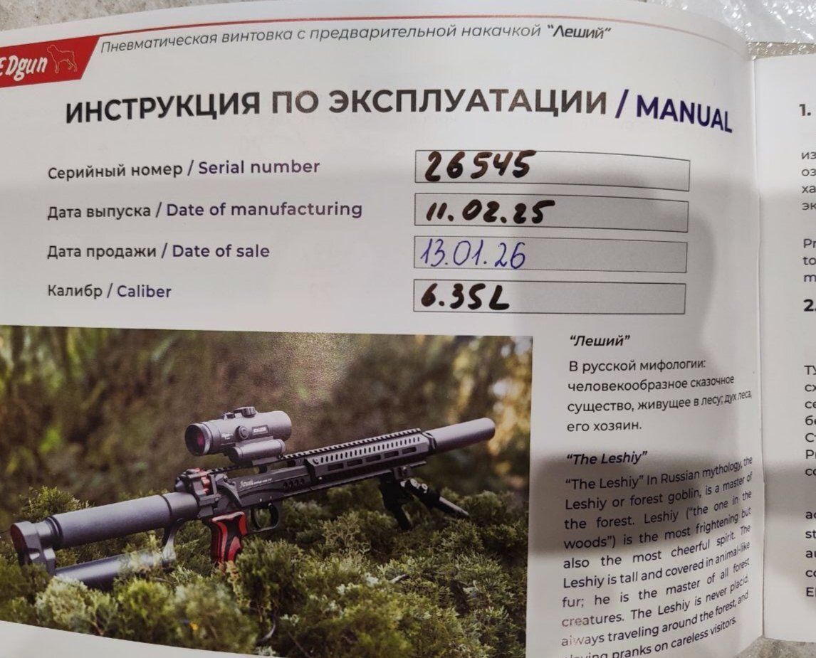 Продаётся новая пневматическая винтовка леший 2.0 Калибр 6,35 мм, Ствол- AP, 350.Продаётся в 3 Дж. Дата покупки 13.01.2026 г. в комплекте для продажи предлагается: 1. Винтовка - 1 шт.; 2. Магазинчик - 2 шт. И четыре пластины к ним; 3. Втулки перепуска; 4. Регулятор поперечного редуктора; 5. Зацеп для алюминиевого кожуха 6. Паспорт - 1 шт.; 7. Сертификат - 1 шт. 8. Щтуцер -1 шт. Причина продажи- нужны денежные средства. Работает все штатно! За Ваш счёт отправлю в любой регион России. Упакую добросовестно. Цену вижу 140 000 руб. Территориально г. Архангельск Телефон:+79052931666 -